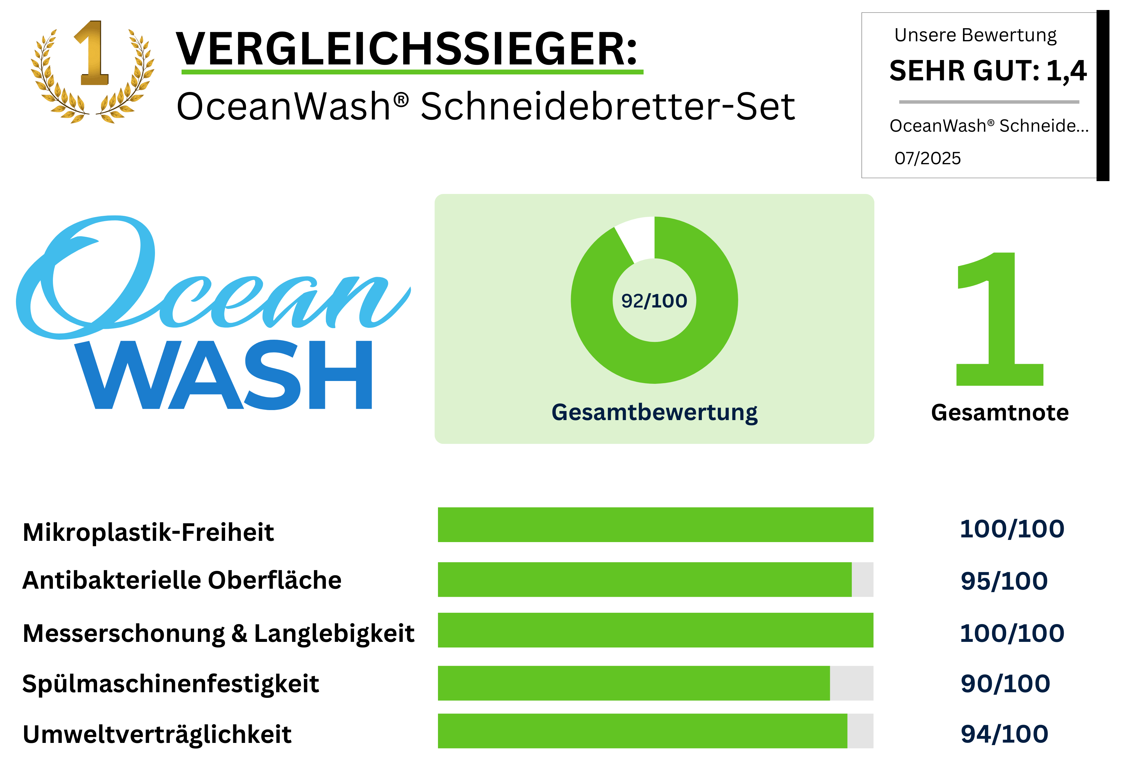 Das OceanWash® Schneidebretter Komplett-Set vereint als einziges Produkt im Test sowohl Mikroplastik-Freiheit als auch antimikrobielle Sicherheit – ohne Abstriche bei Komfort oder Langlebigkeit. Daher ist es besonders wichtig, sich vor dem Kauf umfassend zu informieren.