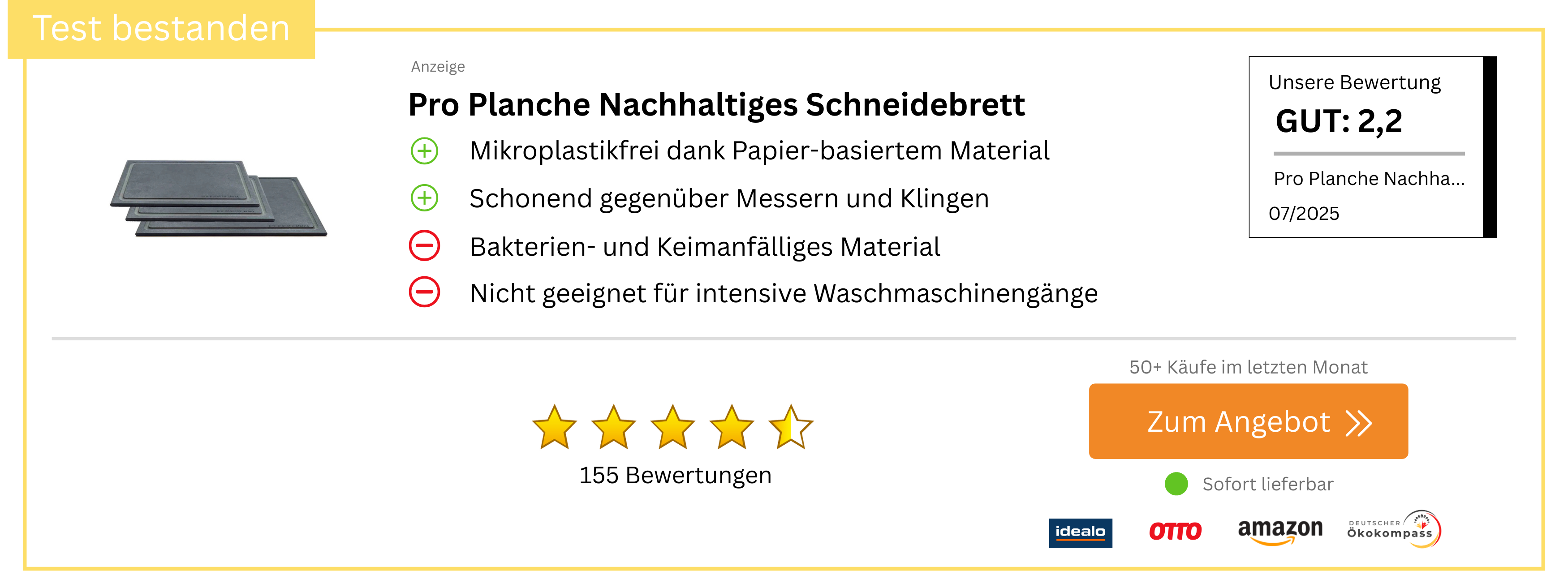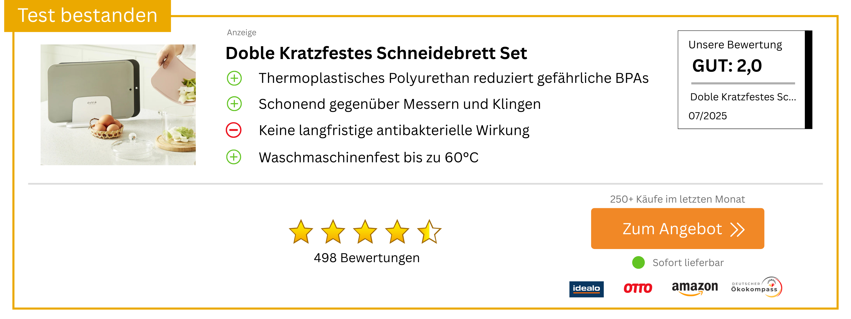 Wir haben über 50 Schneidebretter getestet und dabei alle wichtigen Sicherheits- und Qualitätskriterien berücksichtigt. Die gute Nachricht: Ein Produkt sticht eindeutig hervor und bietet echten Schutz für Ihre Familie. Dieser klare Testsieger reduziert nicht nur die Mikroplastik-Belastung, sondern gewährleistet auch optimale Hygiene und schont dabei hochwertige Messer.