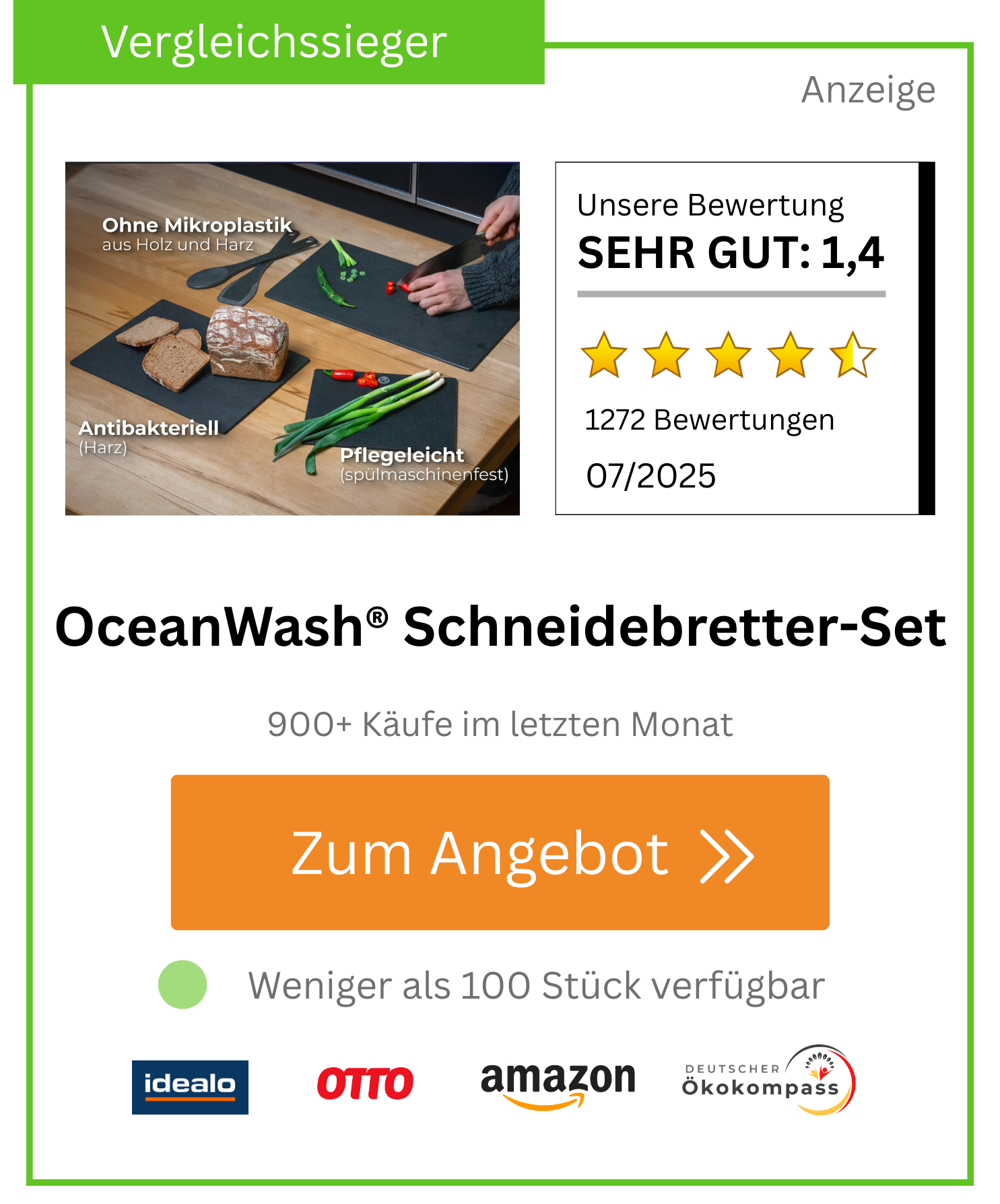 Das OceanWash® Schneidebretter Komplett-Set vereint als einziges Produkt im Test sowohl Mikroplastik-Freiheit als auch antimikrobielle Sicherheit – ohne Abstriche bei Komfort oder Langlebigkeit. Daher ist es besonders wichtig, sich vor dem Kauf umfassend zu informieren.