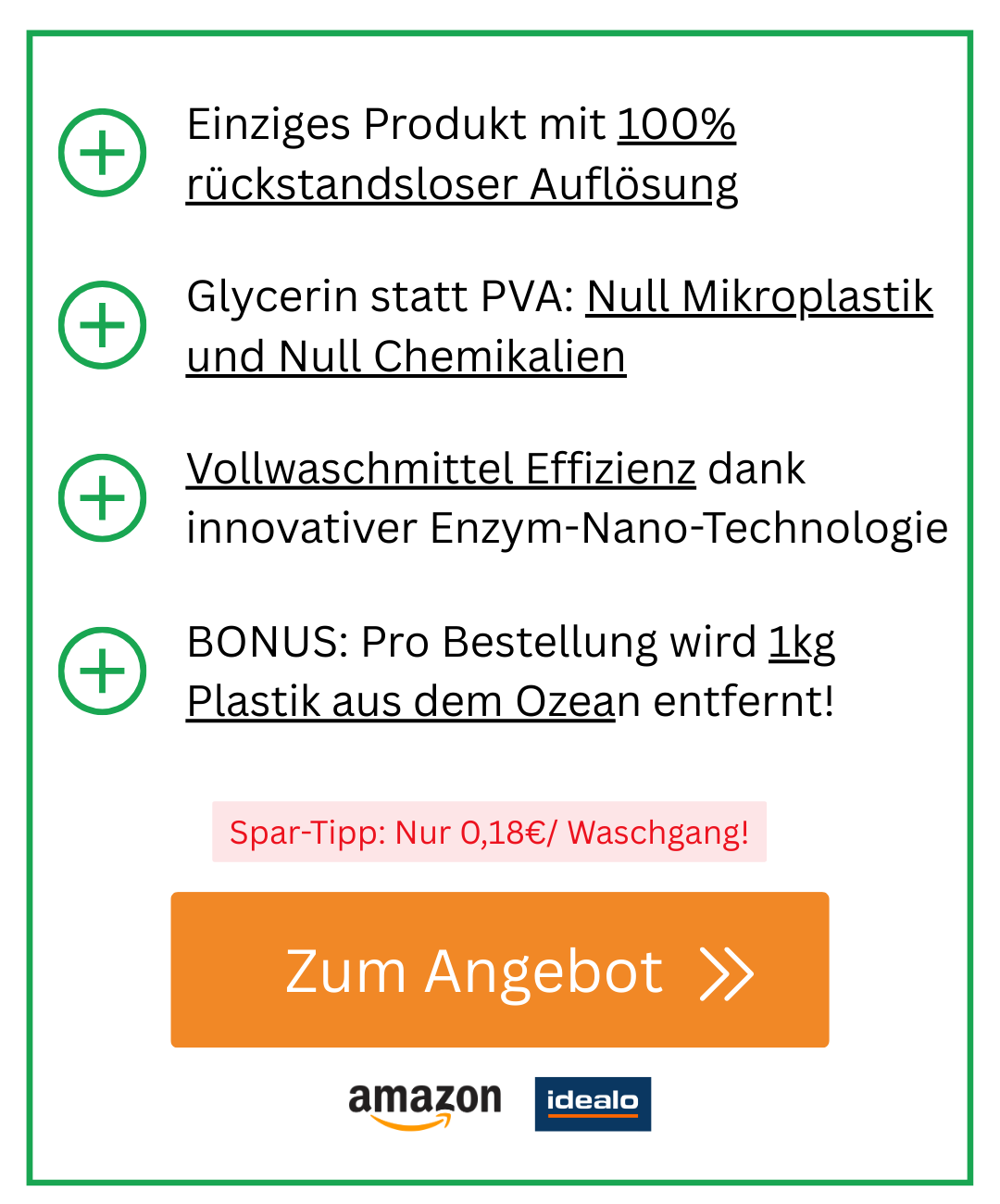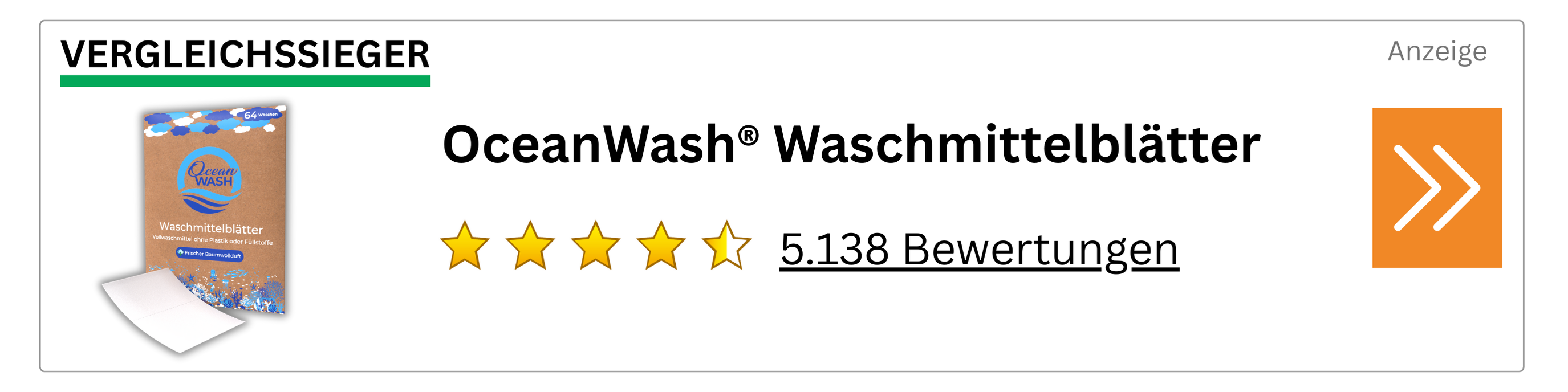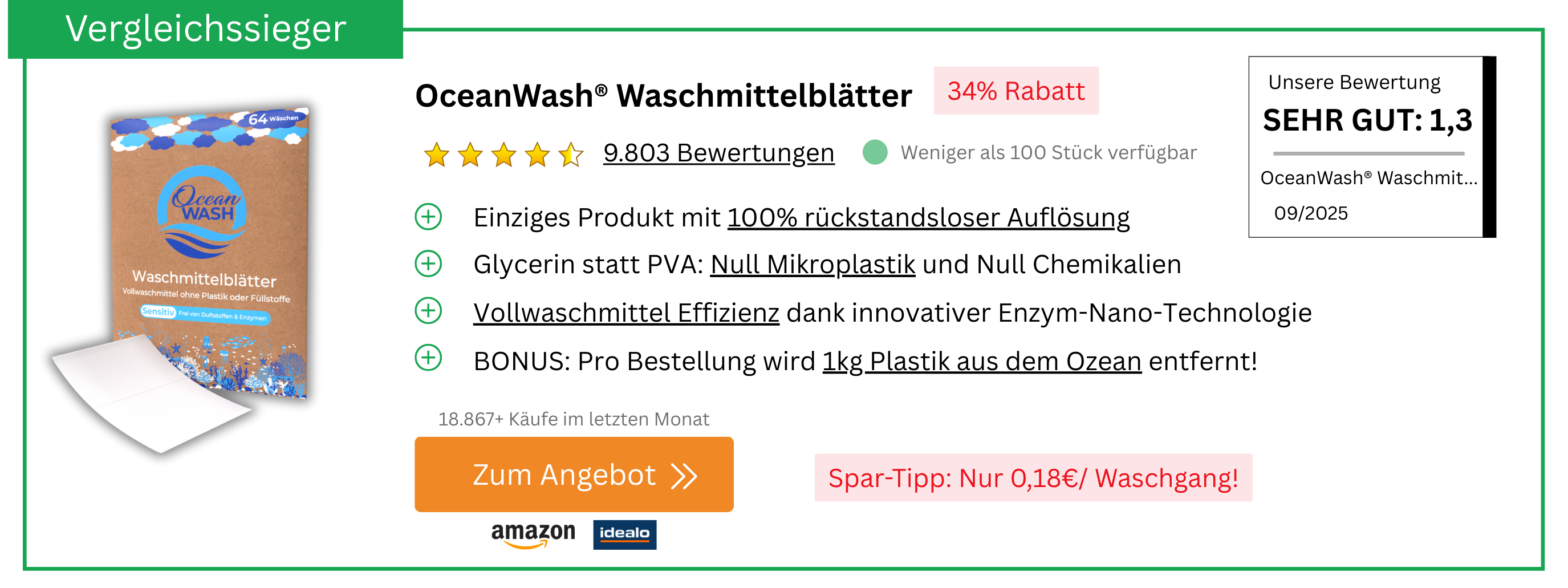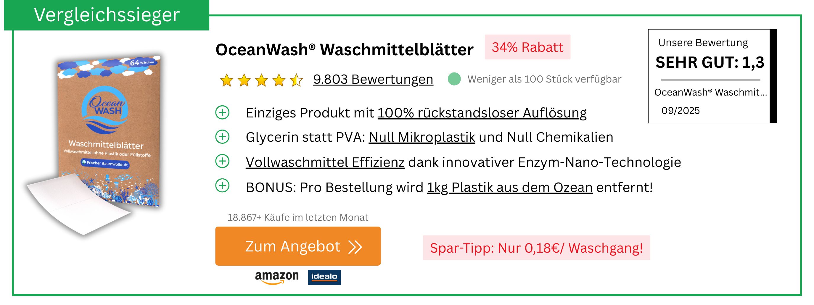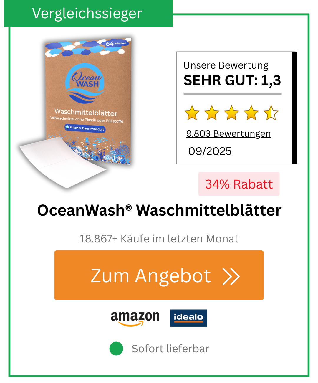 Schluss mit Chemikalien, Mikroplastik, Kontaktallergien und klebrigen Verschlüssen: Waschmittel-Blätter lösen gleich mehrere Probleme auf einmal. Die dünnen Waschstreifen sind vordosiert, platzsparend und hinterlassen keine Chemie-Rückstände in Textilien. Sie verwenden bis zu 90 Prozent weniger Verpackung als herkömmliche Flüssigwaschmittel und machen Überdosierung unmöglich, da jedes Blatt exakt bemessen ist. Verschütten oder Kleckern gehört der Vergangenheit an. Die kompakten Blätter eignen sich besonders für empfindliche Kinderhaut, Reisen und umweltbewusste Haushalte, da sie kaum Platz benötigen. Selbst bei niedrigen Waschtemperaturen lösen sich die Blätter des Testsiegers vollständig auf.. Wir haben über 50 der beliebtesten Waschmittel-Blätter auf Herz und Nieren geprüft. Das Ergebnis? Ebenso eindeutig, wie überraschend: Die OceanWash® Waschmittelblätter ließen sämtliche Konkurrenz klar hinter sich und sicherten sich den Testsieg in ALLEN Kategorien!